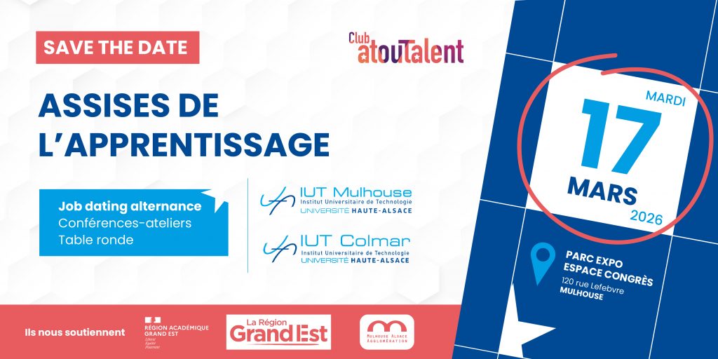 Entreprises, vous souhaitez recruter et échanger avec votre futur alternant ? En partenariat avec le Club Atout Talent et la Région Académique Grand Est, l’IUT de Mulhouse et l’IUT de Colmar vous invitent à la troisième édition des Assisses de l’apprentissage le 17 mars 2026, de 10h à 18h, au Parc Expo à Mulhouse.