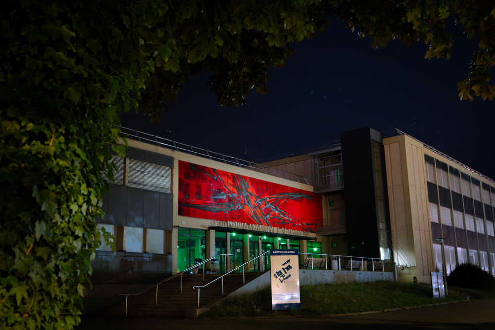 « Entrée de l’IUT de Mulhouse (campus Collines), photographiée de nuit en pause longue. Le bâtiment, bientôt prêt à accueillir les étudiants en septembre, est mis en valeur, encadré par la végétation et illuminé par les étoiles. »